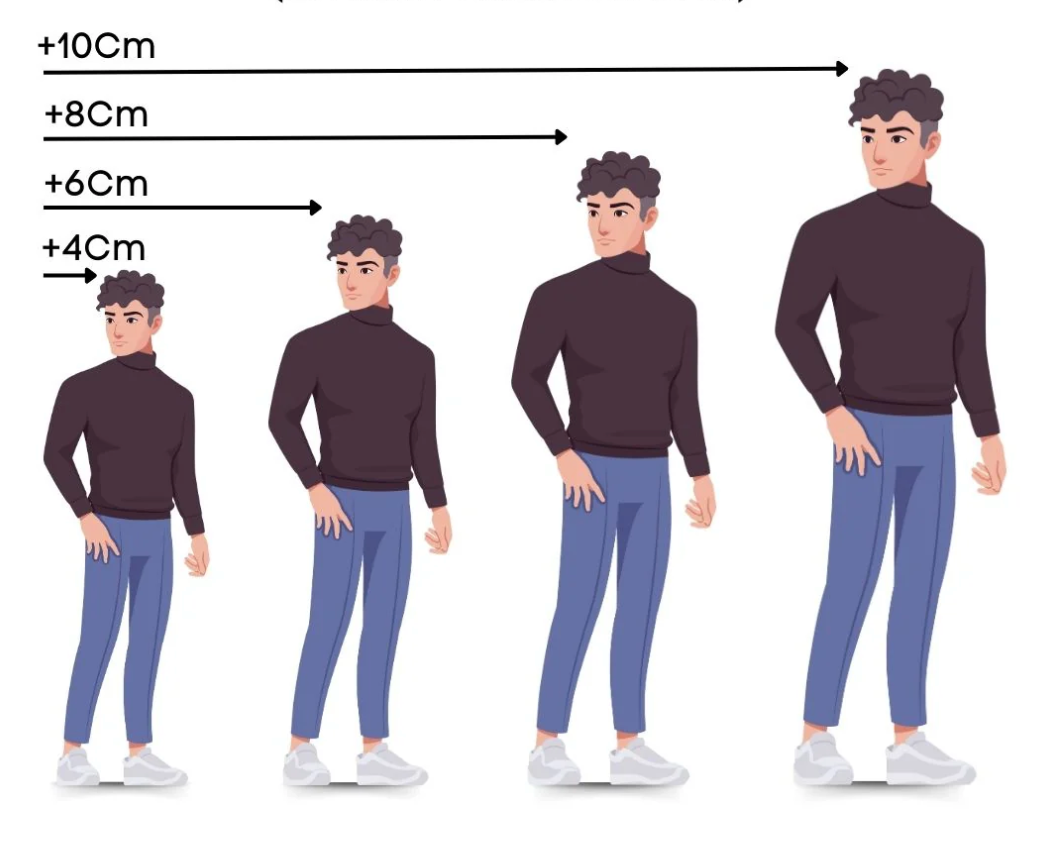 Word 4 cm, 6 cm, 8 cm of zelfs 10 cm langer met elke stap. Een slanke, onzichtbare boost die perfect is voor dagelijks gebruik.