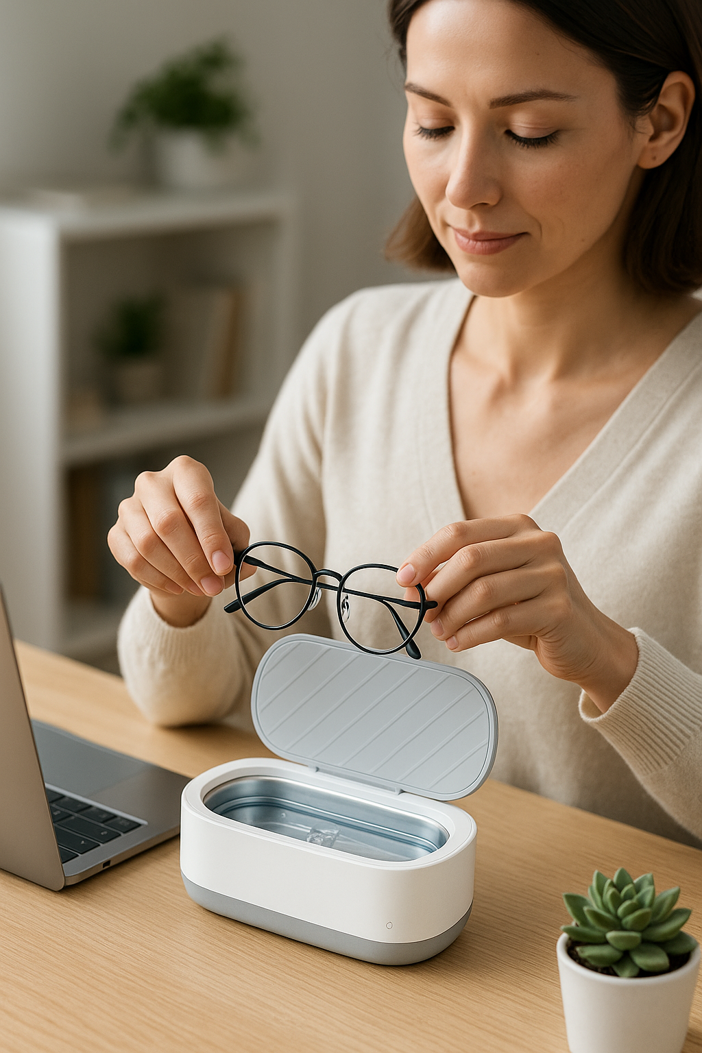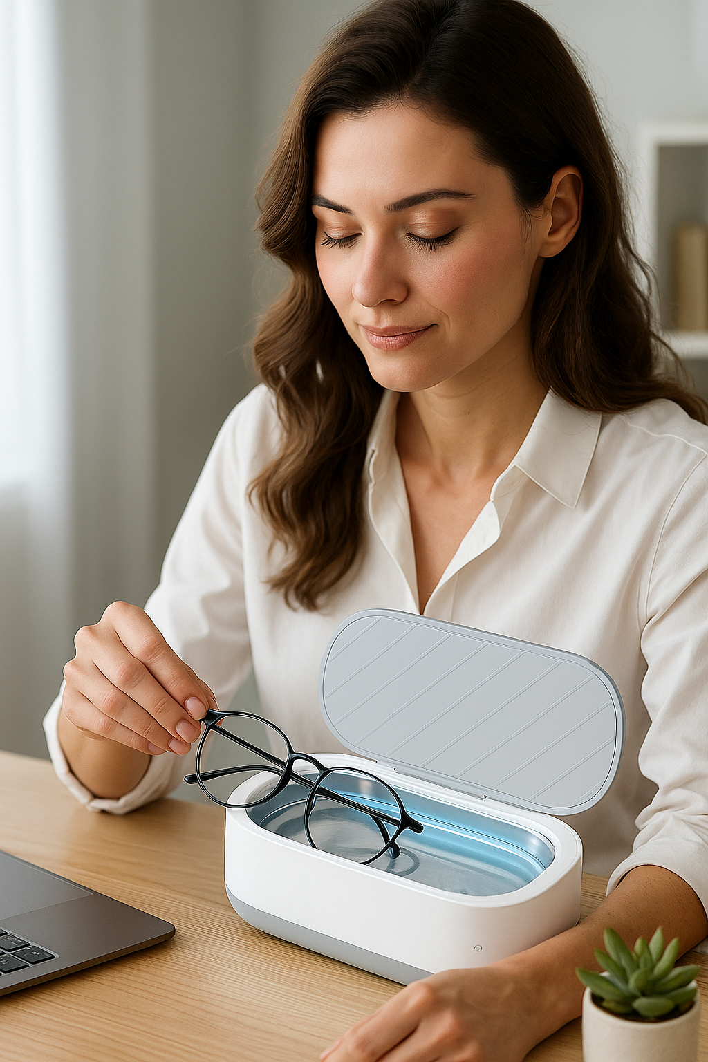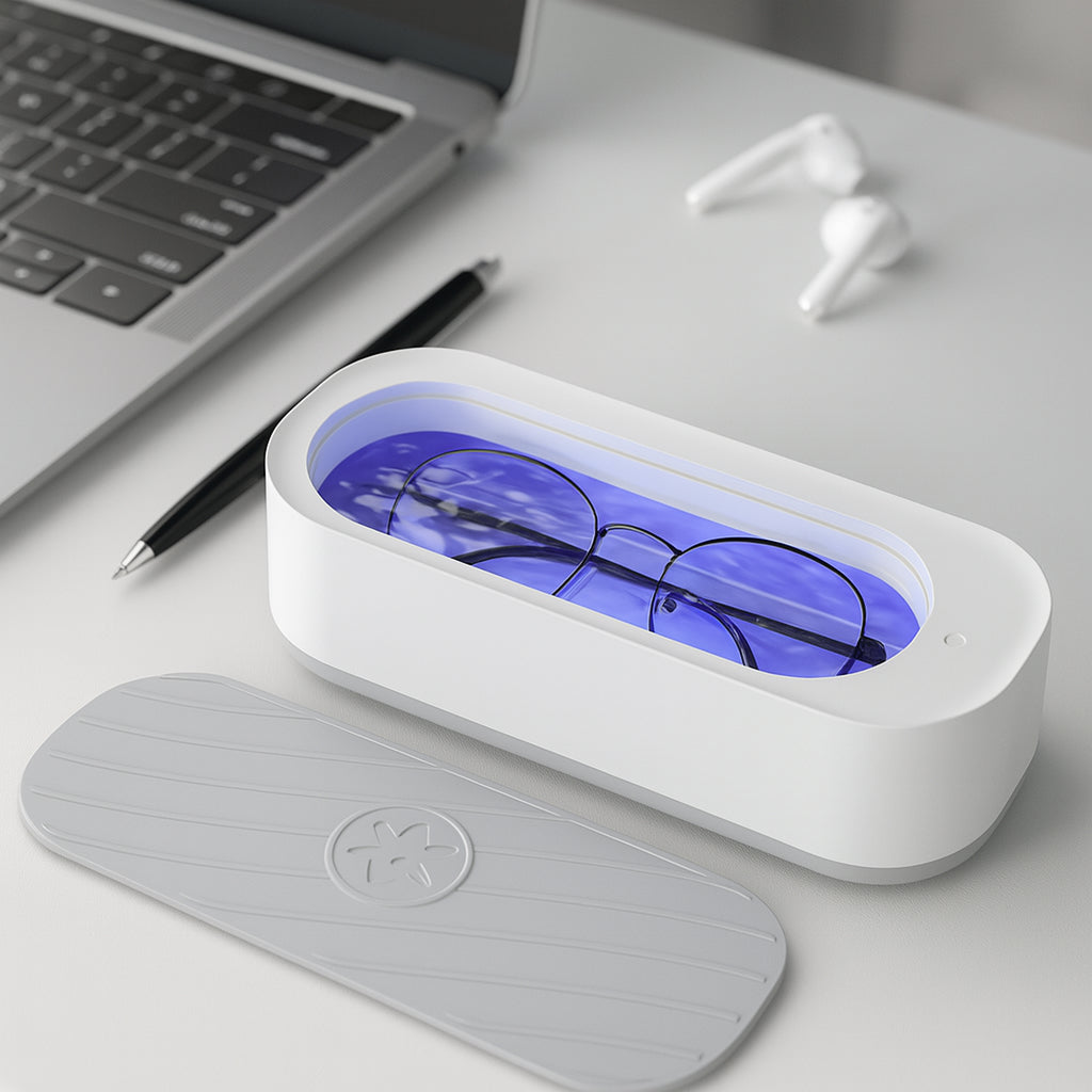 Dankzij de ultrasone technologie worden zelfs de kleinste vuildeeltjes en bacteriën verwijderd — ook op plekken waar een doekje of borsteltje nooit bij kan. Denk aan montuurovergangen, scharnieren, neuspads en contactlenzenhouders. Met slechts één druk op de knop begint een korte maar intensieve reinigingscyclus. Geen gedoe, geen schoonmaakmiddelen, enkel krachtige trillingen en zuiver water.