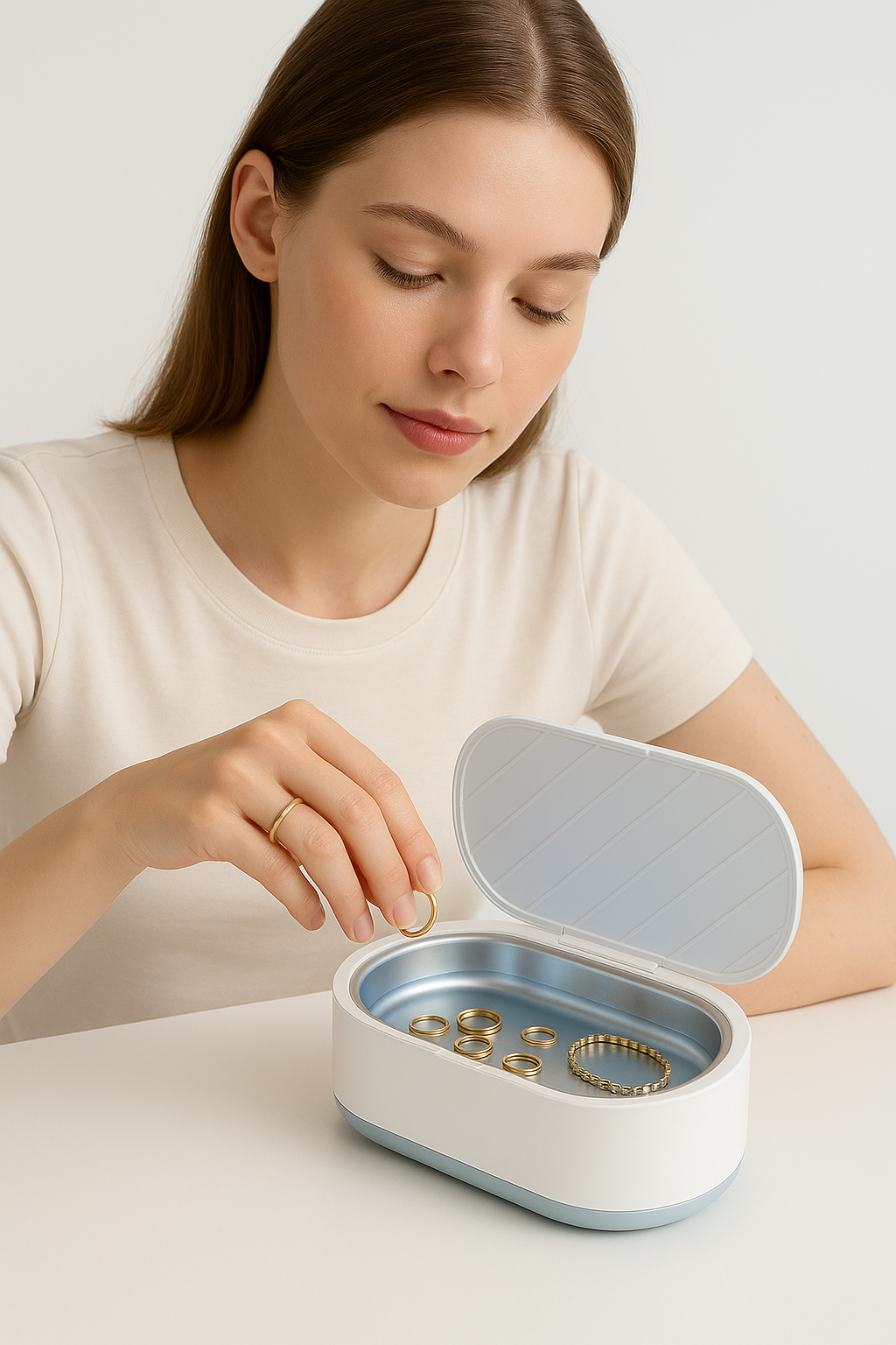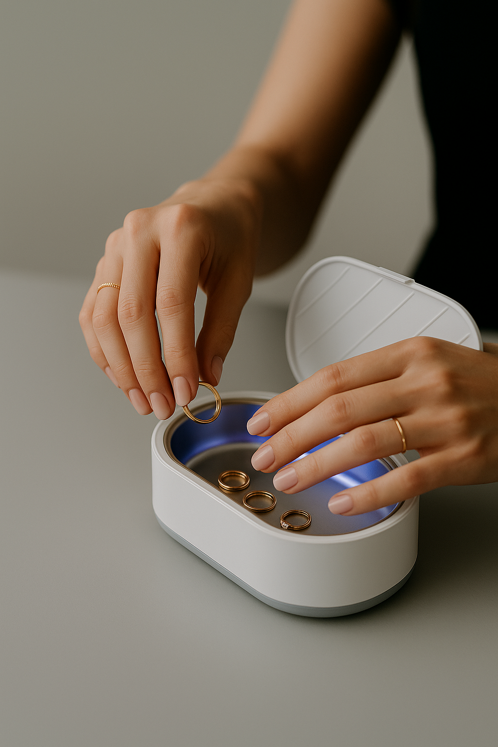 De Ultrasonic Cleaner™ is ontworpen met een strak, minimalistisch design dat past in elke badkamer of werkruimte. Ondanks zijn compacte formaat levert hij krachtige ultrasone golven voor diepe reiniging in slechts 5 tot 10 minuten. Dankzij USB-C opladen neem je hem eenvoudig mee voor gebruik op kantoor, onderweg of op reis – zonder netstroom!